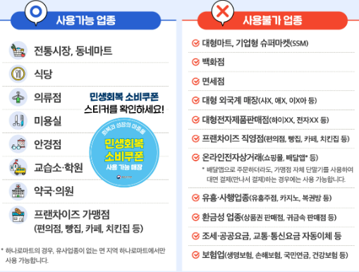 - 지역사랑상품권: 거주지 기준 지역 내 가맹점에서 사용 가능